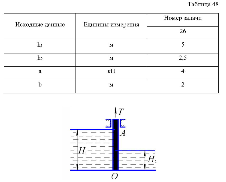 Задача 26 (рис. 3.6). Отверстие шлюза-регулятора прикрыто плоским металлическим затвором высотой a, шириной b и толщиной c = 0,25 × b; удельный вес материала, из которого он изготовлен γз = 11 кН/м3. Глубина воды слева от затвора h1, а справа – h2. Коэффициент трения скольжения f = 0,45. Определить начальную силу тяги T, необходимую для открытия.
