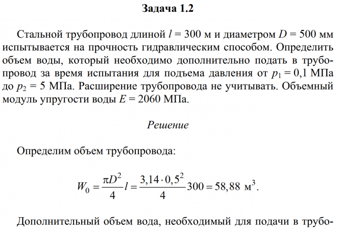 Главная » Учебные материалы » Механика жидкости и газа (МЖГ или Гидравлика) » Решения задач » Несколько классов/семестров » Номер 2 » Стальной трубопровод длиной l = 300 м и диаметром D = 500 мм испытывается на прочность гидравлическим способом. Определить объем воды, который необходимо дополнительно подать в трубопровод за время испытания для подъема давления от p1 = 0,1 МПа до p2