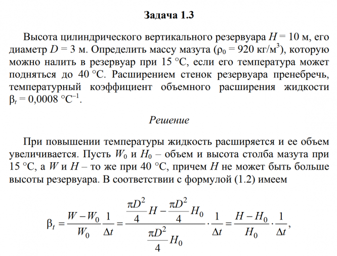 Высота цилиндрического вертикального резервуара H = 10 м, его диаметр D = 3 м. Определить массу мазута (ρ0 = 920 кг/м3), которую можно налить в резервуар при 15 °С, если его температура может подняться до 40 °С. Расширением стенок резервуара пренебречь, температурный коэффициент объемного расширения жидкости βt = 0,0008 °С–1..