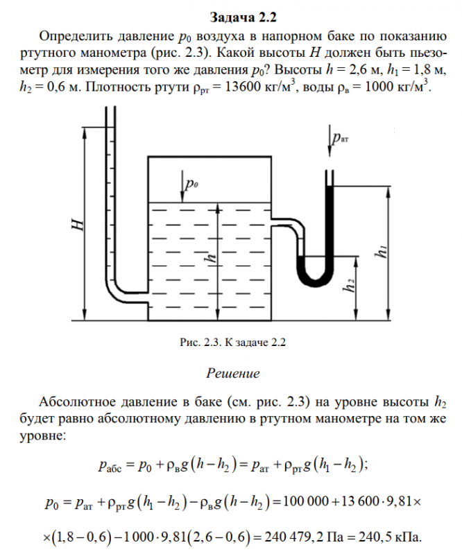 Главная » Учебные материалы » Механика жидкости и газа (МЖГ или Гидравлика) » Решения задач » Несколько классов/семестров » Номер 7 » Определить давление p0 воздуха в напорном баке по показанию ртутного манометра (рис. 2.3). Какой высоты H должен быть пьезометр для измерения того же давления p0? Высоты h = 2,6 м, h1 = 1,8 м, h2 = 0,6 м. Плотность ртути ρрт = 13600 кг/м3, воды ρв =