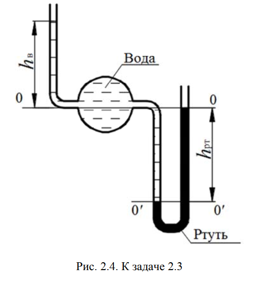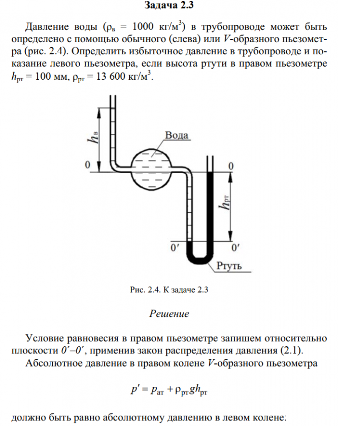 Главная » Учебные материалы » Механика жидкости и газа (МЖГ или Гидравлика) » Решения задач » Несколько классов/семестров » Номер 2.3 » Давление воды (ρв = 1000 кг/м3) в трубопроводе может быть определено с помощью обычного (слева) или V-образного пьезометра (рис. 2.4). Определить избыточное давление в трубопроводе и показание левого пьезометра, если высота ртути в правом пьезометре