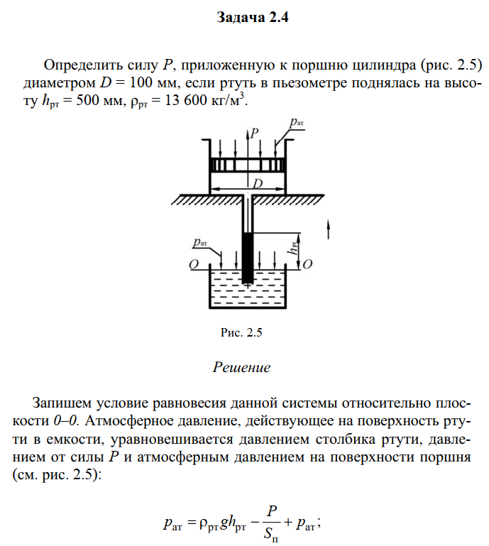Для студентов по предмету Механика жидкости и газа (МЖГ или Гидравлика)Определить силу P, приложенную к поршню цилиндра (рис. 2.5) диаметром D = 100 мм, если ртуть в пьезометре поднялась на высоту hрт = 500 мм, ρрт = 13 6Определить силу P, приложенную к поршню цилиндра (рис. 2.5) диаметром D = 100 мм, если ртуть в пьезометре поднялась на высоту hрт = 500 мм, ρрт = 13 6