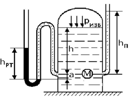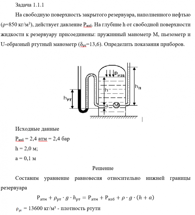 Главная » Учебные материалы » Механика жидкости и газа (МЖГ или Гидравлика) » Решения задач » Несколько классов/семестров » Номер 1 » На свободную поверхность закрытого резервуара, наполненного нефтью (ρ=850 кг/м3), действует давление Ризб. На глубине h от свободной поверхности жидкости к резервуару присоединены: пружинный манометр М, пьезометр и U-образный ртутный манометр (δрт=13