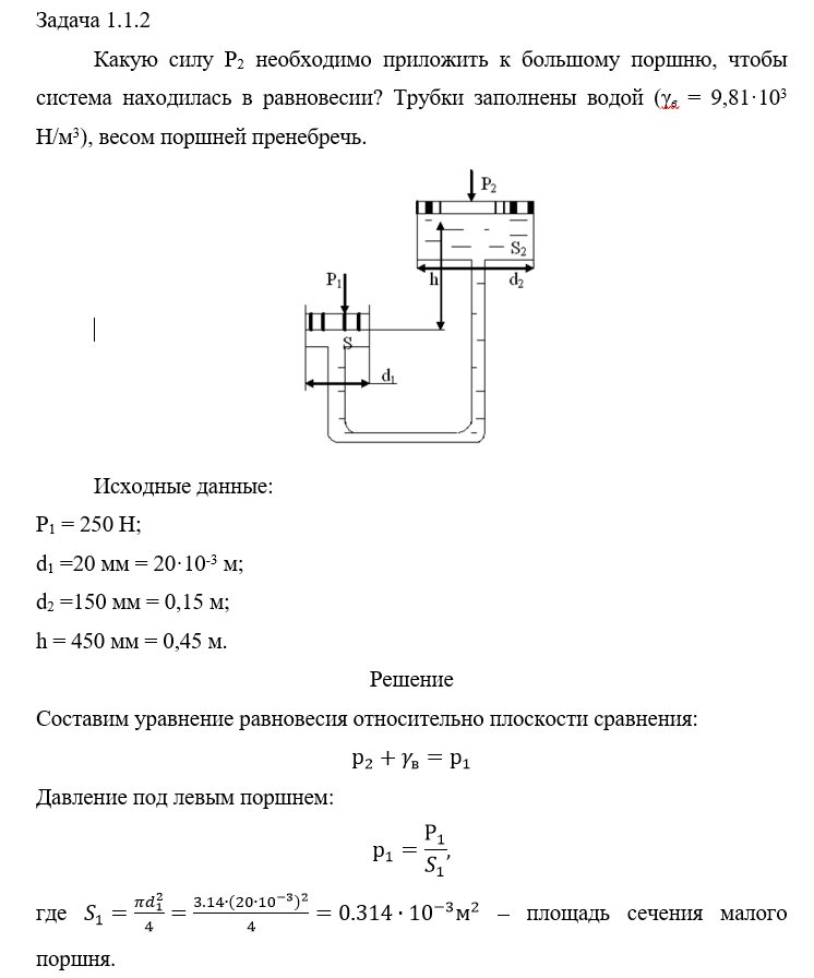 Какую силу Р 2 необходимо приложить к большому поршню, чтобы система находилась в равновесии? Трубки заполнены водой (γ в = 9,81·10 3 Н/м 3 ), весом поршней пренебречь..
