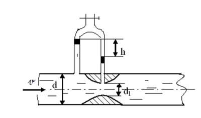 Для измерения расхода воды, протекающей по трубопроводу диаметром d, установлено сопло диаметром d1. Разность уровней в пьезометрах h.Определить расход воды Q. Изменится ли перепад h, если вместо воды в трубе будет протекать нефть при том же расходе? Потерей напора между сечениями, в которых присоединены пьезометрические трубки, пренебречь.