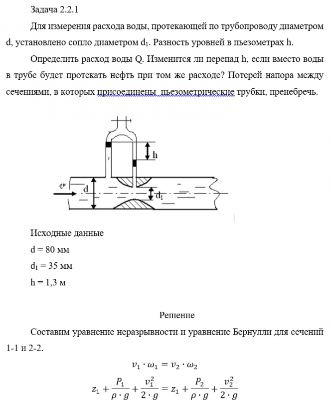 Для измерения расхода воды, протекающей по трубопроводу диаметром d, установлено сопло диаметром d 1 . Разность уровней в пьезометрах h. Определить расход воды Q. Изменится ли перепад h, если вместо воды в трубе будет протекать нефть при том же расходе? Потерей напора между сечениями, в которых присоединены пьезометрические трубки, пренебречь..