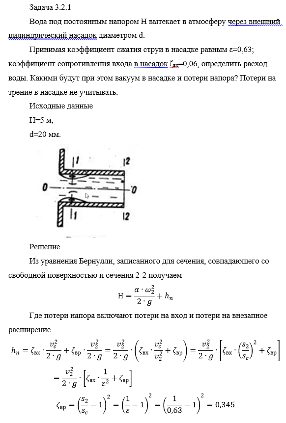 Вода под постоянным напором Н вытекает в атмосферу через внешний цилиндрический насадок диаметром d.Принимая коэффициент сжатия струи в насадке равным ε=0,63; коэффициент сопротивления входа в насадок ζвх=0,06, определить расход воды. Какими будут при этом вакуум в насадке и потери напора? Потери на трение в насадке не учитывать.
