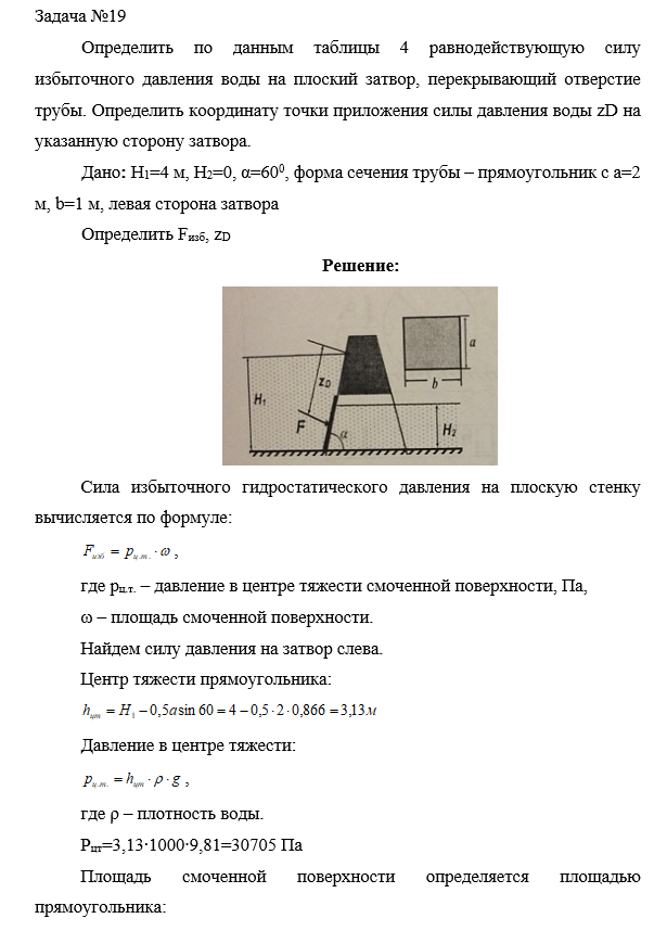 Для студентов по предмету Механика жидкости и газа (МЖГ или Гидравлика)Определить по данным таблицы 4 равнодействующую силу избыточного давления воды на плоский затвор, перекрывающий отверстие трубы (рис. 12). Определить Определить по данным таблицы 4 равнодействующую силу избыточного давления воды на плоский затвор, перекрывающий отверстие трубы (рис. 12). Определить