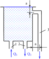 Вода по трубе 1 подается в открытый бак и вытекает по трубе 2. Во избежание переливания воды через край бака устроена вертикальная сливная труба 3 диаметром d = 50 мм. Определить необходимую длину L трубы 3 из условия, чтобы при Q1 = 1 л/с и перекрытой трубе 2 (Q2 = 0) вода не переливалась через край бака. Режим течения считать турбулентным. Принять следующие значения коэффициентов сопротивления: на входе в трубу ξ1 = 0,5; в колене ξ2 = 0,5; на трение по длине трубы λт = 0,03; a = 0,1 м.