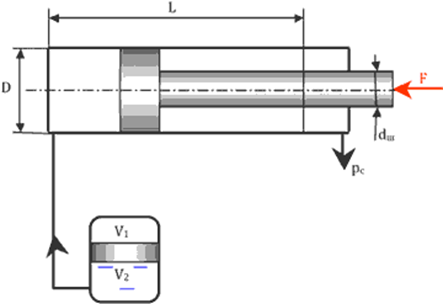 Определить объем гидроаккумулятора Vг=V1+V2, обеспечивающего выпуск штока гидроцилиндра против действия нагрузки F=45 кН. Диаметры: цилиндра D=120 мм; штока d=60 мм; ход штока L=1200 мм; давление на сливе pс=0,3 МПа. Процесс расширения воздуха считать изотермическим, максимальное давление в системе pmax=12 МПа.