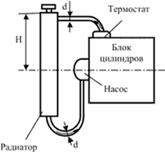 Определить напор, создаваемый насосом системы охлаждения автомобильного двигателя, при следующих данных: подача насоса Q=3,9 л/с; коэффициент сопротивления: блока цилиндров ξ1=3,5; термостата ξ2=2,5; радиатора ξ3=4,0; трубы (шланга) от радиатора до н