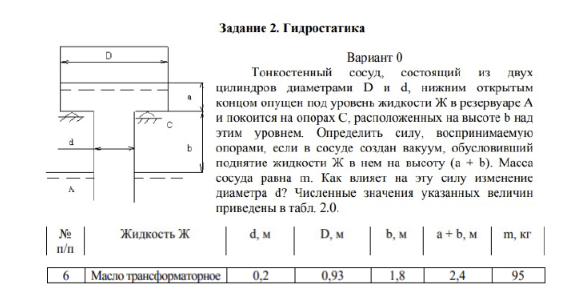 Главная » Учебные материалы » Механика жидкости и газа (МЖГ или Гидравлика) » Решения задач » Несколько классов/семестров » Номер 2 » Вариант 0 » Определить силу, воспринимаемую опорами, если в сосуде из двух цилиндров создан вакуум