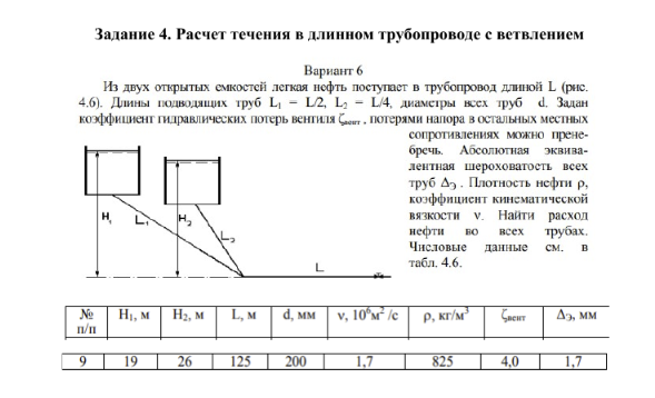 Задача 4: Расчет течения в длинном трубопроводе с ветвлением вариант 6