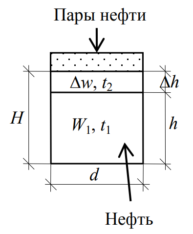 Вертикальный цилиндрический резервуар заполнен нефтью при t1=7 ºC на высоту h=5 м. Определить положение уровня нефти при повышении t2=32 ºC. Расширение стенок резервуара не учитывать. Коэффициент термического расширения βt=0,000721/град. Определить высоту H.