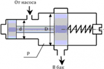 Определить величину предварительного поджатия пружины дифференциального предохранительного клапана (мм), обеспечивающую начало открытия клапана при pн=0,8 МПа. Диаметры клапана: D=24 мм, d=18 мм; жесткость пружины С=6 Н/мм. Давление справа от большог