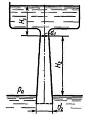 Вода перетекает из верхнего резервуара в нижний по диффузору, диаметры которого d1=100 мм и d2=150 мм,. Коэффициент сопротивления входного участка ξ=0,06, а коэффициент потерь в диффузоре ξД=0,2. Определить, при каком уровне Н1 в верхнем резервуаре абсолютное давление в узком сечении диффузора станет равным нулю, если это сечение расположено над нижним уровнем на высоте H2=1,2 м. Атмосферное давление принять равным Рат=98 кПа.