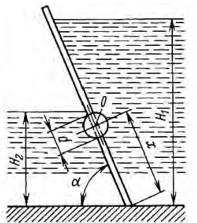 Главная » Учебные материалы » Механика жидкости и газа (МЖГ или Гидравлика) » Решения задач » Несколько классов/семестров » Щитовой затвор должен автоматически опрокидываться для пропуска воды при уровне последней Н1≥6 м. Щит поворачивается на цапфах О. Дано: d=0,4 м, f=0,2 м, В=8м, α=60°, Н2=3 м. Найти: 1) на каком расстоянии x должна быть расположена ось поворота щита
