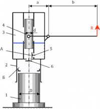 Главная » Учебные материалы » Механика жидкости и газа (МЖГ или Гидравлика) » Решения задач » Несколько классов/семестров » Номер 2 » Вариант 8 » Гидравлический домкрат состоит из неподвижного поршня 1 и скользящего по нему цилиндра 2, на котором смонтирован корпус 3, образующий масляную ванну домкрата, и плунжерный насос 4 ручного привода с всасывающим 5 и нагнетательным 6 клапанами. Определи