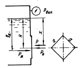 Главная » Учебные материалы » Механика жидкости и газа (МЖГ или Гидравлика) » Решения задач » Несколько классов/семестров » Номер 2 » Вариант 11 » Квадратное отверстие (а x а = 0,4 X 0,4 м) в вертикальной стенке резервуара с бензином (р = 750 кг/м3) закрыто крышкой (рис. 2.14). Найти силу давления на крышку и точку ее приложения, если центр отверстия находится на глубине H = 2,0 м, вакуум на по