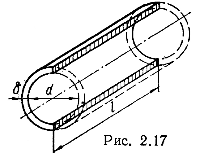 Найти минимальную толщину δ стенок стальной трубы (рис. 2.17) диаметром d=25мм, если давление жидкости р=10 МПа, а допускаемое напряжение на растяжение для стали [σ]=150 МПа. Весом жидкости пренебречь.