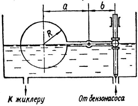 Определить избыточное давление бензина (ρ=750 кг/м3), подводимого к поплавковой камере карбюратора от бензонасоса по трубке диаметром d=5 мм, если в момент открытия отверстия, перекрываемого иглой, шаровой поплавок (R=30 мм) погружен в жидкость наполовину (рис. 2.21). Масса поплавка m1=30 г, масса иглы m2=15 г, плечи рычага а=45 мм, b=20 мм. Трением в шарнире и массой рычага и архимедовой силой, действующей на иглу, пренебречь.