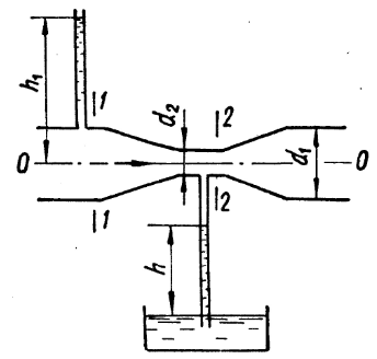 По горизонтальной трубе диаметром d1=100 мм, имеющей сужение d2=40 мм, движется вода (расход (Q=6 л/с). Определить абсолютное давление в узком сечении, если уровень воды в открытом пьезометре перед сужением h1=1,5 м (рис. 3.4). При каком расходе воды ртуть в трубке, присоединенной к трубопроводу в узком сечении, поднимется на высоту h=10 см, если при этом h1=1,2 м? Потерями напора пренебречь.