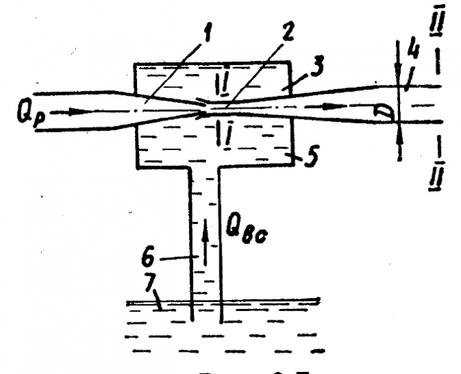 На рис. 3.7 показана принципиальная схема струйного насоса. Жидкость под давлением подается к насадку 1 в камеру смешения 2, переходящую в диффузор 3, за которым следует отводящий (напорный) трубопровод 4. Выходное сечение сопла и входное сечение камеры смешения находятся в замкнутой камере 5, к которой примыкает всасывающий трубопровод 6.