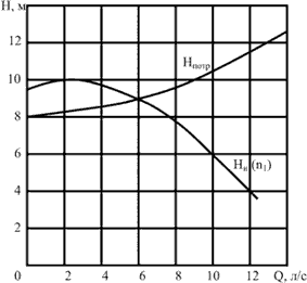Центробежный насос работает с частотой вращения n1=1500 об/мин и перекачивает жидкость по трубопроводу, для которого задана кривая потребного напора Нпотр=f(Q) (см. рис.). На том же графике дана характеристика насоса Hн при указанной частоте вращения