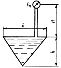 Определить силу, действующую на каждую из четырех стенок сосуда, имеющего форму перевернутой правильной пирамиды, если рм=0,5 МПа, Н=4 м, h=1,2 м; каждая сторона основания пирамиды b=0,8 м. Плотность жидкости ρ=800 кг/м3.
