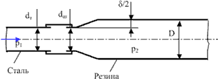 Жидкость с плотностью ρ=1000 кг/м3 протекает по металлической трубе с диаметром dт=10 мм, а затем по резиновому шлангу, который имеет начальный диаметр dш=10 мм. Под действием давления жидкости p2 резиновый шланг растягивается до диаметра D. Жесткост