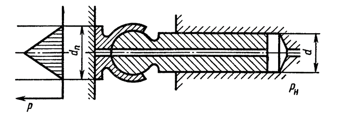 Определить диаметр пяти dп плунжера аксиально-плунжерного насоса из условия безотрывного скольжения пяты по диску с 5 % - ным запасом по прижимающей силе. Закон распределения давления в зазоре принять линейным (см. эпюру). Диаметр плунжера d=12 мм. Площадь отверстия в плунжере не учитывать.