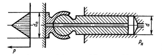 Главная » Учебные материалы » Механика жидкости и газа (МЖГ или Гидравлика) » Решения задач » Несколько классов/семестров » Номер 1 » Вариант 44 » Определить диаметр пяти dп плунжера аксиально-плунжерного насоса из условия безотрывного скольжения пяты по диску с 5 % - ным запасом по прижимающей силе. Закон распределения давления в зазоре принять линейным (см. эпюру). Диаметр плунжера d=12 мм. П