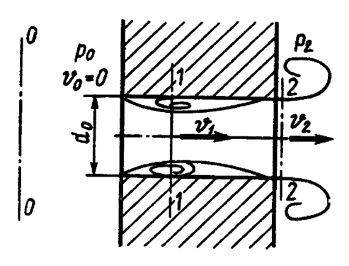 Через жиклер, представляющий собой отверстие диаметром dо=2 мм в стенке толщиной δ=5 мм, происходит истечение жидкости в полость, заполненную той же жидкостью при избыточном давлении p2=1 МПа. Определить давление по другую сторону стенки p0, при кото