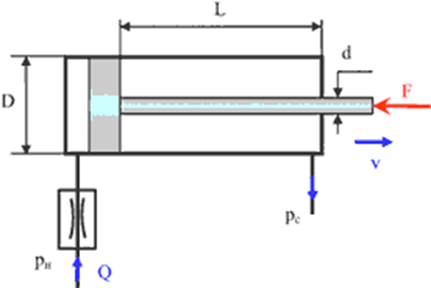 Определить время полного хода поршня гидроцилиндра при движении против нагрузки, если давление на входе в дроссель рн=16 МПа, давление на сливе рс=0,3 МПа. Нагрузка вдоль штока F=35 кН, коэффициент расхода дросселя μ=0,62, диаметр отверстия в дроссел