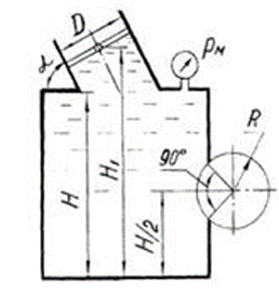 Задача 2-24. D = 0,36 м, Н1 = 2,7 м, а = 45°, R = 0,12 м, Ризб= 0,1МПа.