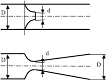 Сравнить коэффициенты сопротивления мерного сопла d, установленного в трубе D, и расходомера Вентури, состоящего из такого же сопла диаметром d и диффузора. Коэффициенты сопротивления определить как отношение суммарной потери напора к скоростному напору в трубопроводе. Дано отношение диаметров D/d=2. Принять коэффициенты сопротивлений: сопла ξс=0,05; диффузора ξдиф=0,15 (оба коэффициента относятся к скорости в узком сечении). Определить потери напора, вызываемые мерным соплом hс и hр, при одинаковой скорости потока в трубе υ=3 м/с.