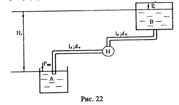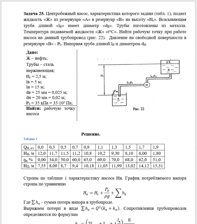 Центробежный насос, характеристика которого задана (табл. 1), подает жидкость «Ж» из резервуара «А» в резервуар «В» на высоту «Нг ». Всасывающая труба длиной «lВ » имеет диаметр «dВ ». Трубы изготовлены из металла. Температура подаваемой жидкости «Ж» «t°C». Найти рабочую точку при работе насоса на данный трубопровод (рис. 22). Давление на свободной поверхности в резервуаре «В» - P0. Напорная труба длиной lН и диаметром dН.