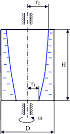 При отливке цилиндрической полой заго­товки во вращающейся относительно вертикальной оси форме из-за действия сил тяжести нижний внутренний радиус r1будет меньше верхнего внутреннего радиуса r2. Определить их разность, если высота отливки H=0,5 м, форма вращает­ся с угловой скоростью (w=200 с-1; ее диаметр D=200 мм и она в начальный момент заполнена на 30 % своего объема.