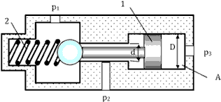 На рисунке представлена конструктивная схема гидрозамка, проходное сечение которого открывается при подаче в полость Aуправляющего потока жидкости с давлением ру. Определить, при каком минимальном значе­нии ру толкатель поршня 1 сможет открыть шариковый кла­пан, если известно: предварительное усилие пружины 2F=50 Н; D=25 мм, d=15 мм, P1=0,5 МПа, P2=0,2 МПа. Силами трения пренебречь.