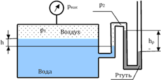 Главная » Учебные материалы » Механика жидкости и газа (МЖГ или Гидравлика) » Решения задач » Несколько классов/семестров » Номер 1 » Вариант 12 » Определить абсолютное давление воздуха в баке Р1, если при атмосферном давлении, соответствующем ha=760 мм рт. ст., показание ртутного вакуумметра hрт=0,2 м, высота h=1,5 м. Каково при этом показание пружинного вакуумметра? Плотность ртути ρ=13600 кг