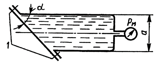 Определить силу, действующую на болты 1 крышки бака, если показание манометра рм=2 МПа, а угол наклона крышки α=45°. В сечении бак имеет форму квадрата со стороной а=200 мм.