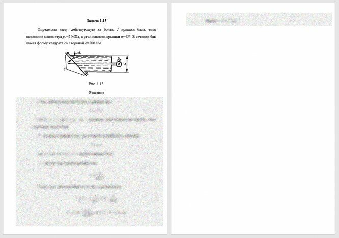 Главная » Учебные материалы » Механика жидкости и газа (МЖГ или Гидравлика) » Решения задач » Несколько классов/семестров » Номер 1 » Вариант 15 » Определить силу, действующую на болты 1 крышки бака, если показание манометра рм=2 МПа, а угол наклона крышки α=45°. В сечении бак имеет форму квадрата со стороной а=200 мм.