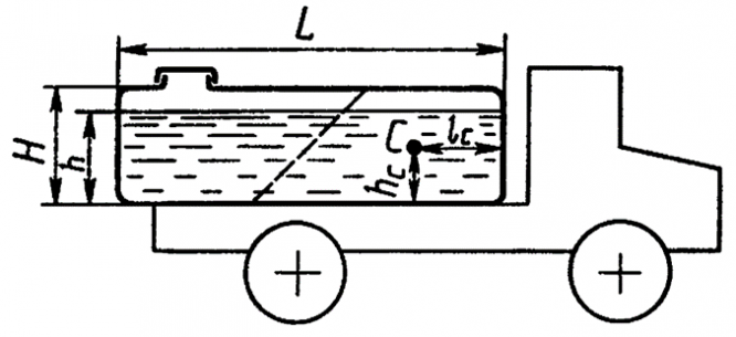 Главная » Учебные материалы » Механика жидкости и газа (МЖГ или Гидравлика) » Решения задач » Несколько классов/семестров » Номер 1 » Вариант 53 » Определить расположение центра тяжести C бетонного раствора (hC и lC), залитого в закрытый кузов автомобиля при его торможении с ускорением a = g. Считать, что кузов имеет форму параллелепипеда: L = 1,92 м, H = 1,2 м и h = 1 м.
