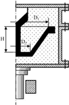 Определить минимальную угловую скорость литейной формы ω, при которой шлак и легкие включения (плотностью ρ2) будут иметь возможность выделится из расплавленного метала (плотностью ρ1) в середину формы. Размеры отливаемой детали: D1=300 мм; D2 =200 мм; H=300 мм.