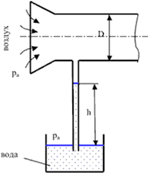 Определить весовой расход воздуха по трубе с плавно закругленным входом и цилиндрической частью диаметром D=200 мм, если показания вакуумметра в виде вертикальной стеклянной трубки, опущенной в сосуд с водой, h=250 мм. Коэффициент сопротивления входной части тру­бы (до места присоединения вакуумметра) ξ = 0,1. Плотность воздуха ρ=1,25 кг/м3.