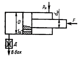 Главная » Учебные материалы » Механика жидкости и газа (МЖГ или Гидравлика) » Решения задач » Несколько классов/семестров » Номер 3 » Вариант 27 » Жидкость с плотностью ρ=850 кг/м3 пода­ется от насоса в гидроцилиндр, а затем через отверстие в поршне площадью Sо=5 мм2 и гидродроссель Д в бак (рб=0). 1) Определить, при какой площади проходного сечения дросселя Д поршень будет находиться в неподв