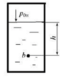 Определить избыточное давление газа р0и в резервуаре, если абсолютное давление в точке b равно 2 бара. Точка погружена в жидкость на глубину h=2,0 м. Плотность жидкости ρ=1000 кг/м3.