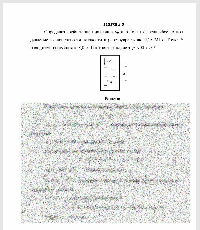 Главная » Учебные материалы » Механика жидкости и газа (МЖГ или Гидравлика) » Решения задач » САФУ им. Ломоносова » Несколько классов/семестров » Номер 2 » Вариант 8 » Определить избыточное давление ри и в точке b, если абсолютное давление на поверхности жидкости в резервуаре равно 0,15 МПа. Точка b находится на глубине h=3,0 м. Плотность жидкости ρ=900 кг/м3