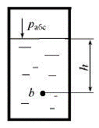 Определить избыточное давление ри и в точке b, если абсолютное давление на поверхности жидкости в резервуаре равно 0,15 МПа. Точка b находится на глубине h=3,0 м. Плотность жидкости ρ=900 кг/м3.