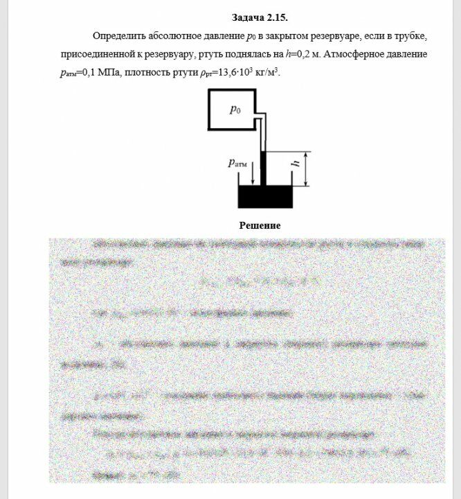 Для студентов САФУ им. Ломоносова по предмету Механика жидкости и газа (МЖГ или Гидравлика)Определить абсолютное давление р0 в закрытом резервуаре, если в трубке, присоединенной к резервуару, ртуть поднялась на h=0,2 м. Атмосферное давление Определить абсолютное давление р0 в закрытом резервуаре, если в трубке, присоединенной к резервуару, ртуть поднялась на h=0,2 м. Атмосферное давление
